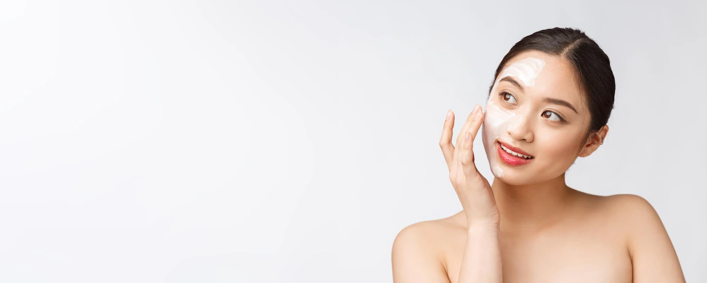 ① 用手指或海綿塗抹於臉部5個部位(額頭、鼻子、下巴、雙頰)。
